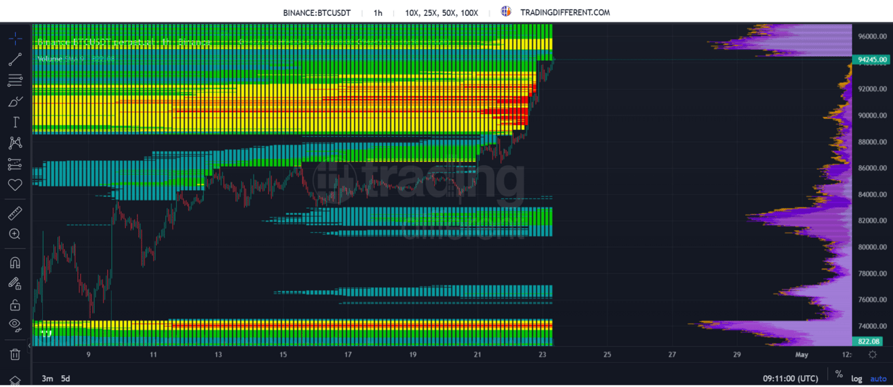 📈Mapa de Liquidaciones: En el mapa de liquidaciones observamos que ya se tomaron todas las liquidaciones importantes de la zona de los 93.000 $, en este momento no tenemos mas liquidaciones fuertes pero si unas decentes en los 95.000 $, por debajo no tenemos nada destacable, lo que son buenas noticias.