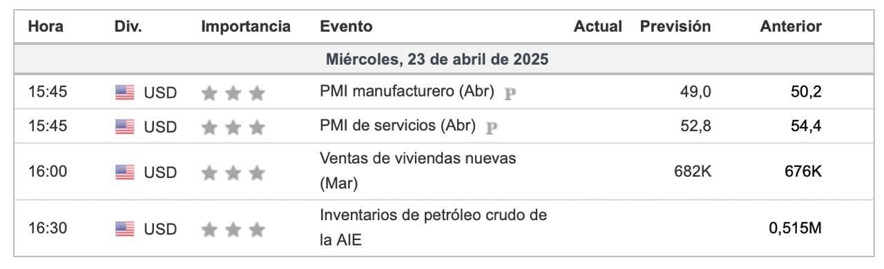Luego tendriamos las Ventas de viviendas nuevas (Marzo): Una pequeña mejora, pero nada explosivo. Al no haber una gran sorpresa, este dato no tiene un impacto fuerte directo. Pero junto al PMI flojo, refuerza la idea de una economía tibia que se traduce en apoyo indirecto al cripto mercado.