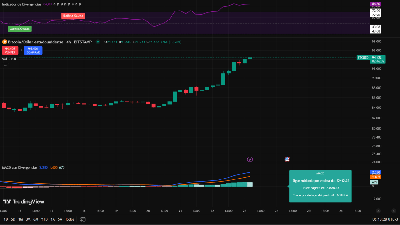 🗣️Resumen de lo esperado hoy: Bitcoin no ha parado de subir pese a estar sobre comprado en grafico de cuatro horas, justo ahora se encuentra mucho mas aun, incluso el grafico diario esta llegando a sobrecompra, ya seria hora de ver algunas correcciones antes de seguir subiendo, estas correcciones no deberian ser muy fuertes pero necesarias, el MACD tambien esta perdiendo algo de fuerza, todos nos indica una correccion pronto.