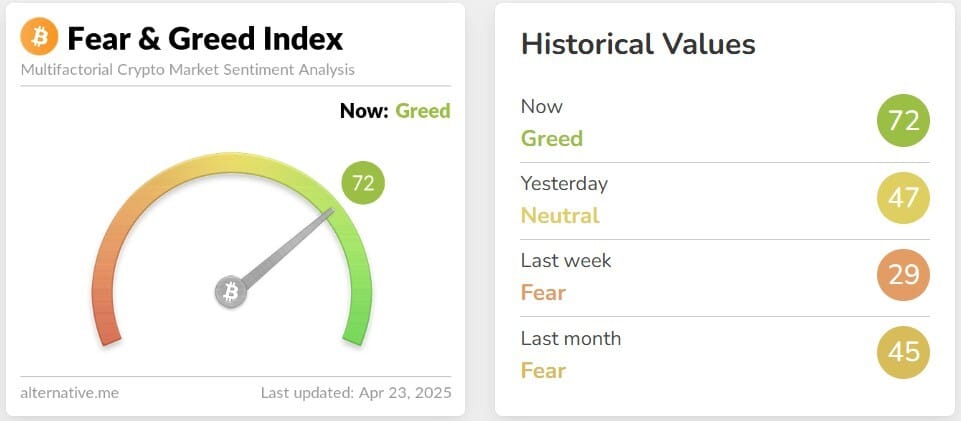 💜 Sentimiento de mercado: Despues de mucho tiempo con miedo el mercado por fin esta en avaria con 72 puntos.