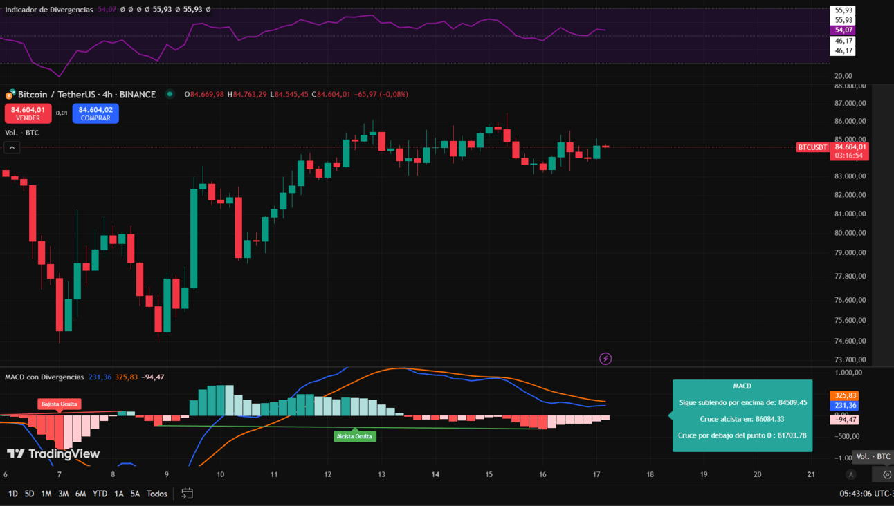 🗣️Resumen de lo esperado hoy: En el gráfico de cuatro horas, Bitcoin continúa dentro del mismo canal lateral, entre los 82.600 $ y los 86.000 $. En las últimas horas no se ha registrado ningún movimiento relevante: el volumen, el MACD y el RSI se mantienen leves, con oscilaciones cortas y poca fuerza. Aún no hay una señal clara sobre hacia qué dirección podría romper el canal.