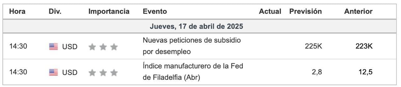 Este indicador mide la salud del sector manufacturero. Una caída importante, como la prevista frente al dato anterior (de 12,5 a 2,8), puede señalar desaceleración económica. Esto también puede interpretarse como un posible freno en las políticas monetarias restrictivas, lo que beneficiaría a los activos de riesgo como Bitcoin… aunque si la caída es muy fuerte, podría generar miedo general y provocar ventas.