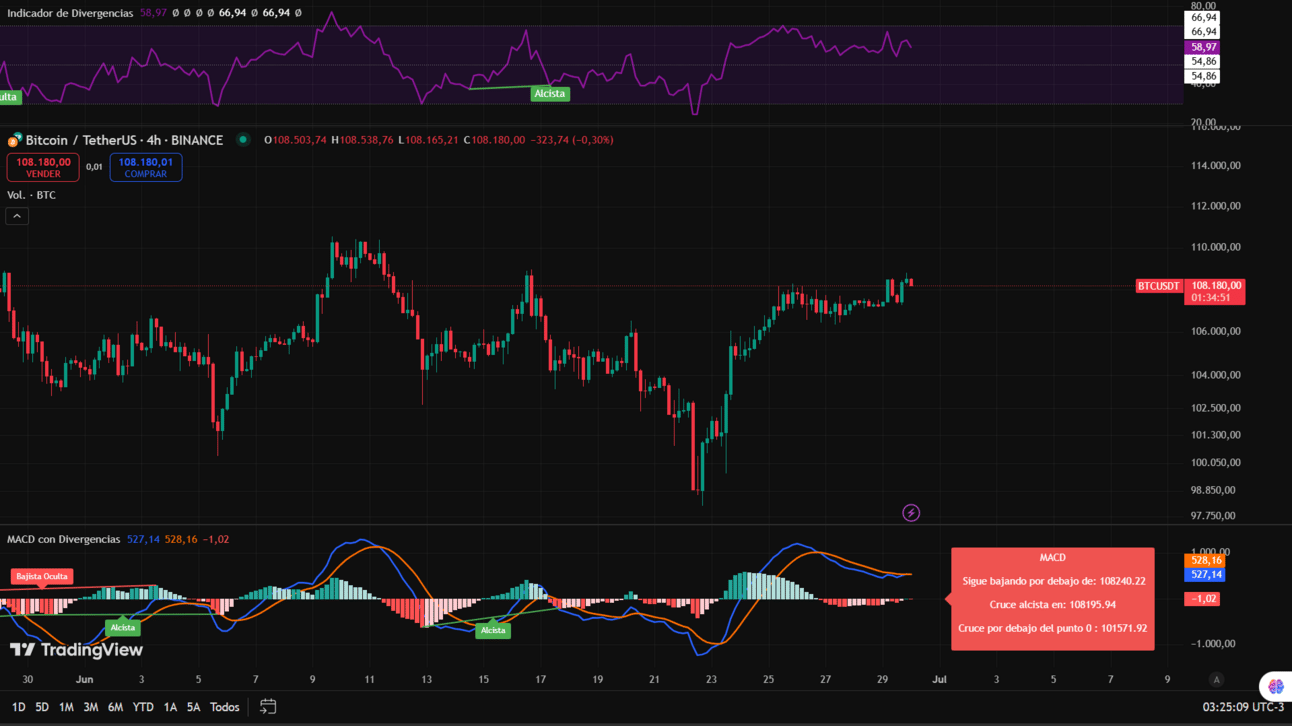 🗣️ Resumen de lo esperado hoy: Bitcoin se recupera con fuerza, ahora cotizando en torno a los 108 251 $. Además, la tregua frágil en Medio Oriente aunque aún inestable y la caída del dólar han generado un entorno de menor aversión al riesgo, beneficiando activos como Bitcoin. Sin embargo, el movimiento se mantiene sin volumen fuerte, abriendo la puerta a consolidaciones o retrocesos técnicos antes de una posible continuación alcista.