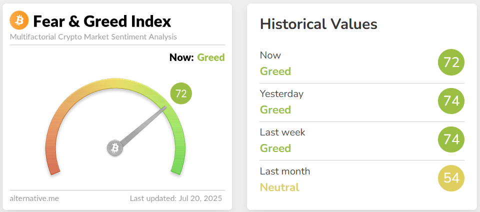 💜 Sentimiento de mercado: Estamos con 72 puntos, en avaricia.
