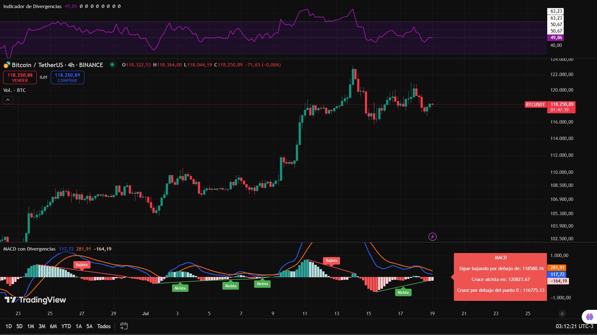 🗣️ Resumen de lo esperado hoy: El mercado muestra debilidad técnica, con el MACD profundizando su cruce bajista y el RSI sin dirección firme. Para hoy se espera un rango de consolidación entre 116.500 y 118.500, aunque un aumento en el volumen de ventas podría empujar hacia los soportes inferiores. Las probabilidades de un rebote técnico aumentan si el RSI logra sostenerse por encima de 50 y el MACD comienza a reducir su histograma negativo.