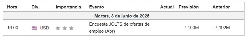 📅Calendario Económico de Investing: Hoy solo tenemos una noticia relevante y son las encuestas JOLTS de ofertas de empleo.