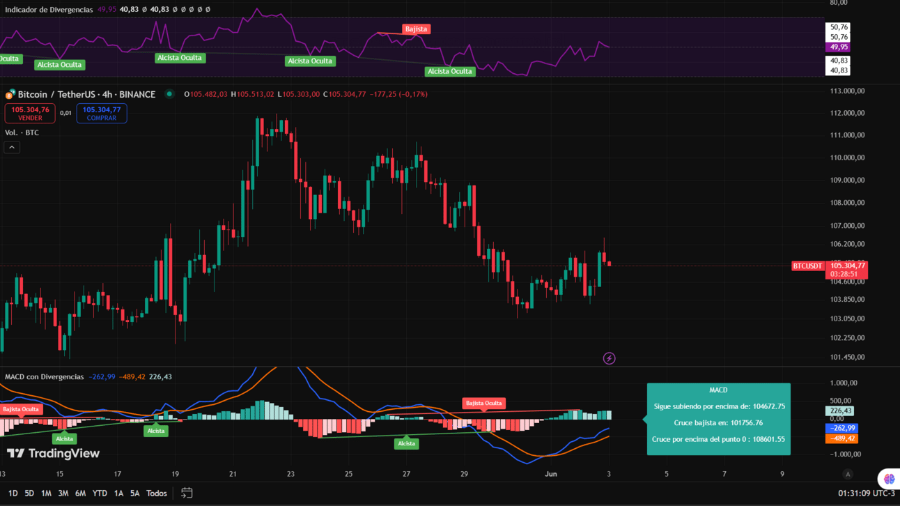 Ambos RSI están en zona neutral, y hace tiempo que no se encontraban tan alineados en valor. Esto indica una fase de consolidación antes de un movimiento más fuerte. Las señales actuales apuntan a una posible caída, pero no se puede descartar un giro alcista repentino, especialmente si se rompe la resistencia clave.