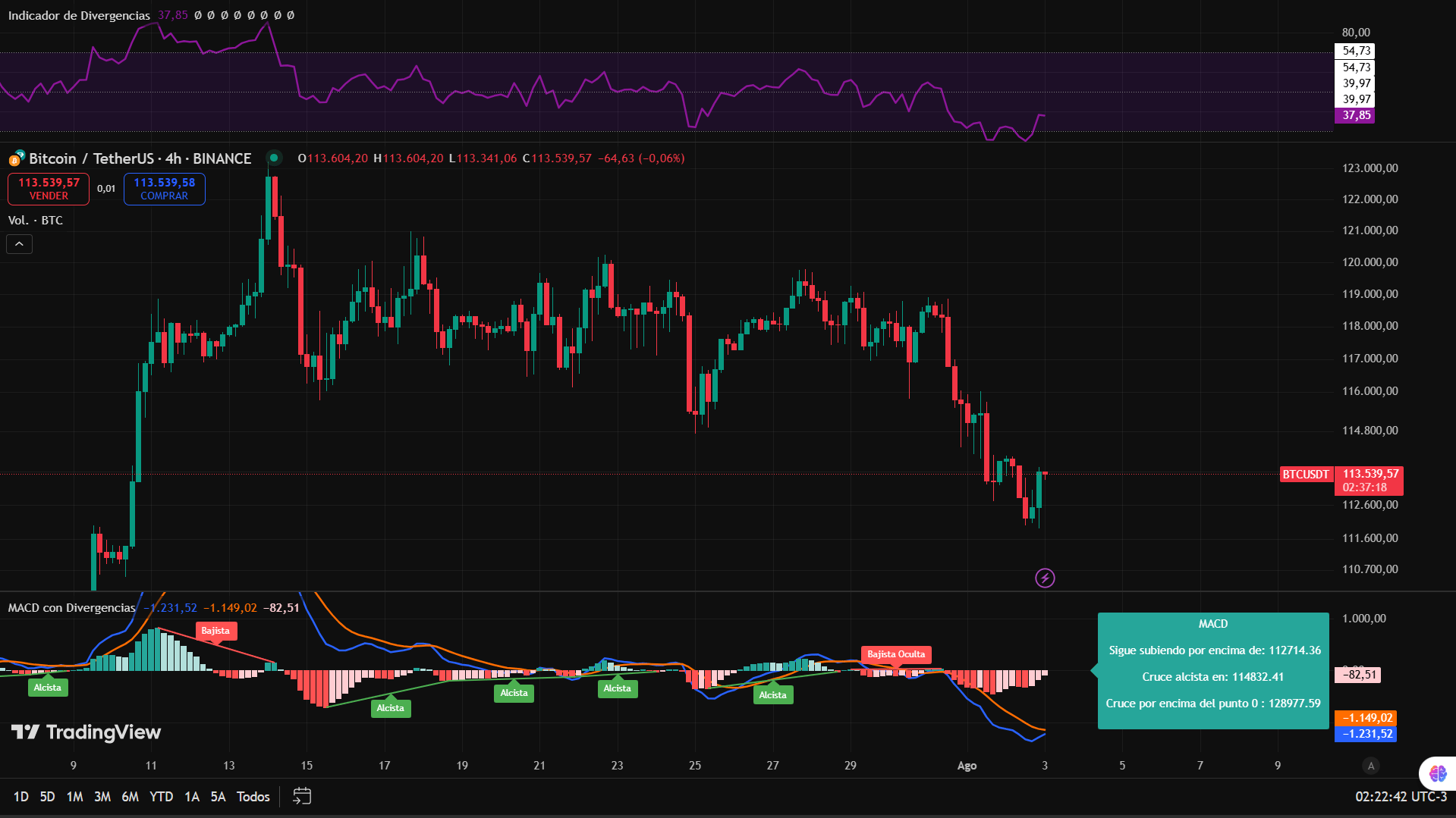 🗣️ Resumen de lo esperado hoy: Bitcoin muestra un rebote técnico desde la zona de $113.300 y cotiza en $113.540. El MACD comenzó a girar al alza, aunque sigue en terreno negativo: aún es un rebote, no una reversión. La presión bajista pierde fuerza, pero los compradores necesitan superar los $114.800 para validar un cambio real. A corto plazo, el momentum mejora, pero la estructura general se mantiene vulnerable.