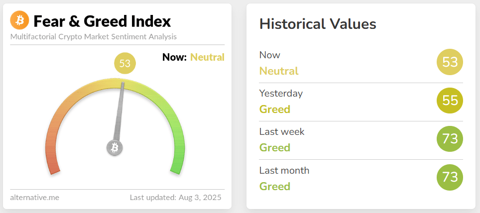 💜 Sentimiento de mercado: Bajamos a zona neutral con 53 puntos.