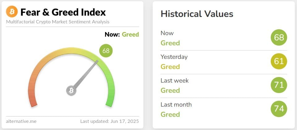 💜 Sentimiento de mercado: Actualmente estamos en 68 de avaricia.