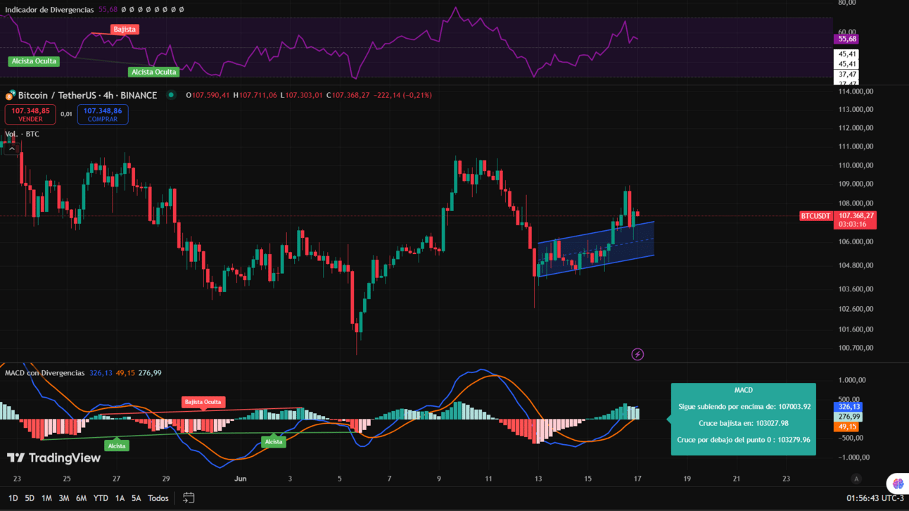 Este nivel solía ser la resistencia superior del canal, pero tras la ruptura ha pasado a funcionar como soporte. Además, coincide con zonas donde el precio se detuvo y perdió fuerza en días anteriores, por lo que es probable que actúe de manera similar en las próximas jornadas.Resistencia clave: 108.600 $