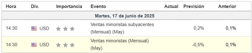 Los datos de ventas minoristas en EE. UU. mostraron señales mixtas: las ventas subyacentes se prevee que subiran un 0,2%, en línea con lo esperado y mejor que el mes anterior, lo que refleja cierta solidez en el consumo básico. Sin embargo, las ventas minoristas totales se muestra una caida inesperada de un -0,5%, muy por debajo del valor anterior (+0,1%), lo que sugiere una posible debilidad general en el gasto de los consumidores.
