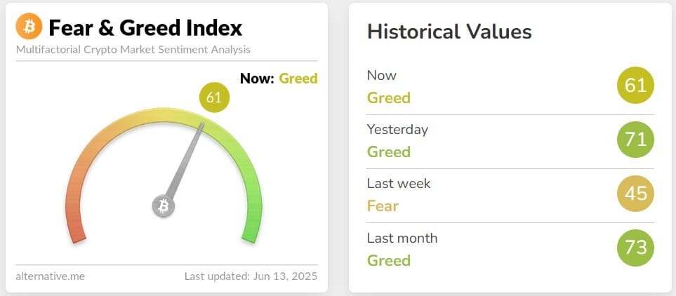 💜 Sentimiento de mercado: Seguimos estando en avaricia con 61 puntos.