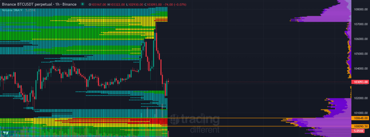 En cuanto a resistencias, los 105.000 $ aunque fueron superados brevemente ayer demostraron ser una trampa de liquidez, ya que el precio cayó inmediatamente después. Por tanto, este nivel sigue siendo una resistencia clave, y ahora con más fuerza, ya que ha limpiado las liquidaciones cercanas.