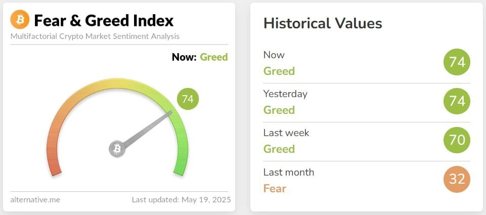 💜 Sentimiento de mercado: La avaricia se mantiene en 74 puntos.