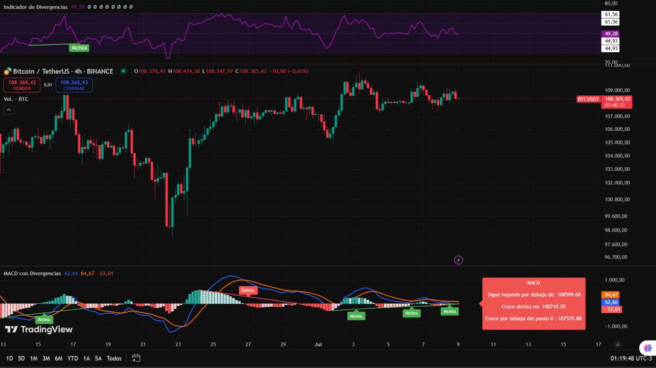 Zona cercana al cruce por debajo del punto 0 en el MACD. Si se pierde, podríamos ver una caída más pronunciada hacia los 106.000 $.Resistencia clave: 108.600 $