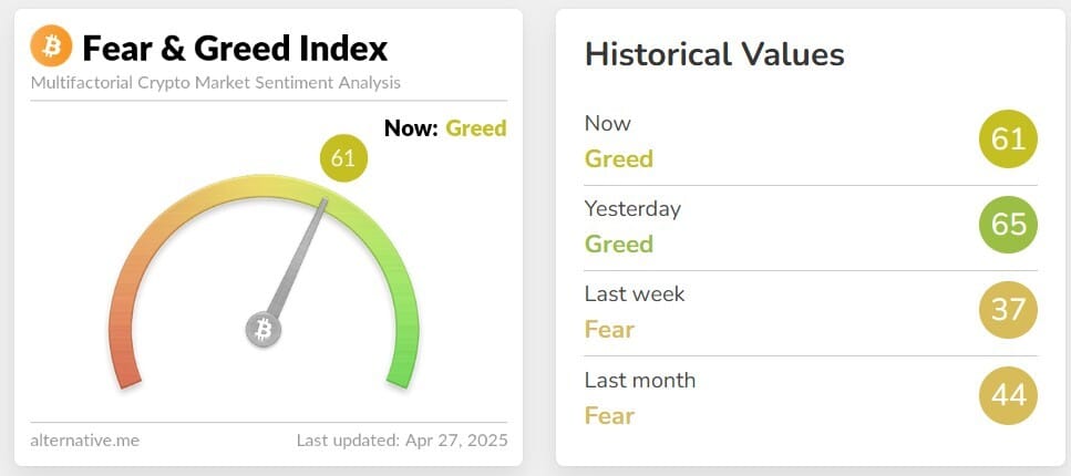 💜 Sentimiento de mercado: El sentimiento bajo un poco hasta los 61 puntos.
