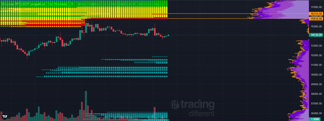 📈Mapa de Liquidaciones: En cuanto al mapa de liquidaciones, se volvio a generar una pequeña zona importante entre los 95.800 $ y los 96.300 $, si bien no es muy grande sigue siendo una zona importante de loquidaciones a corto plazo, el precio podria ir a tomarlas en los proximos dias, por debajo seguimos sin tener nada destacable.
