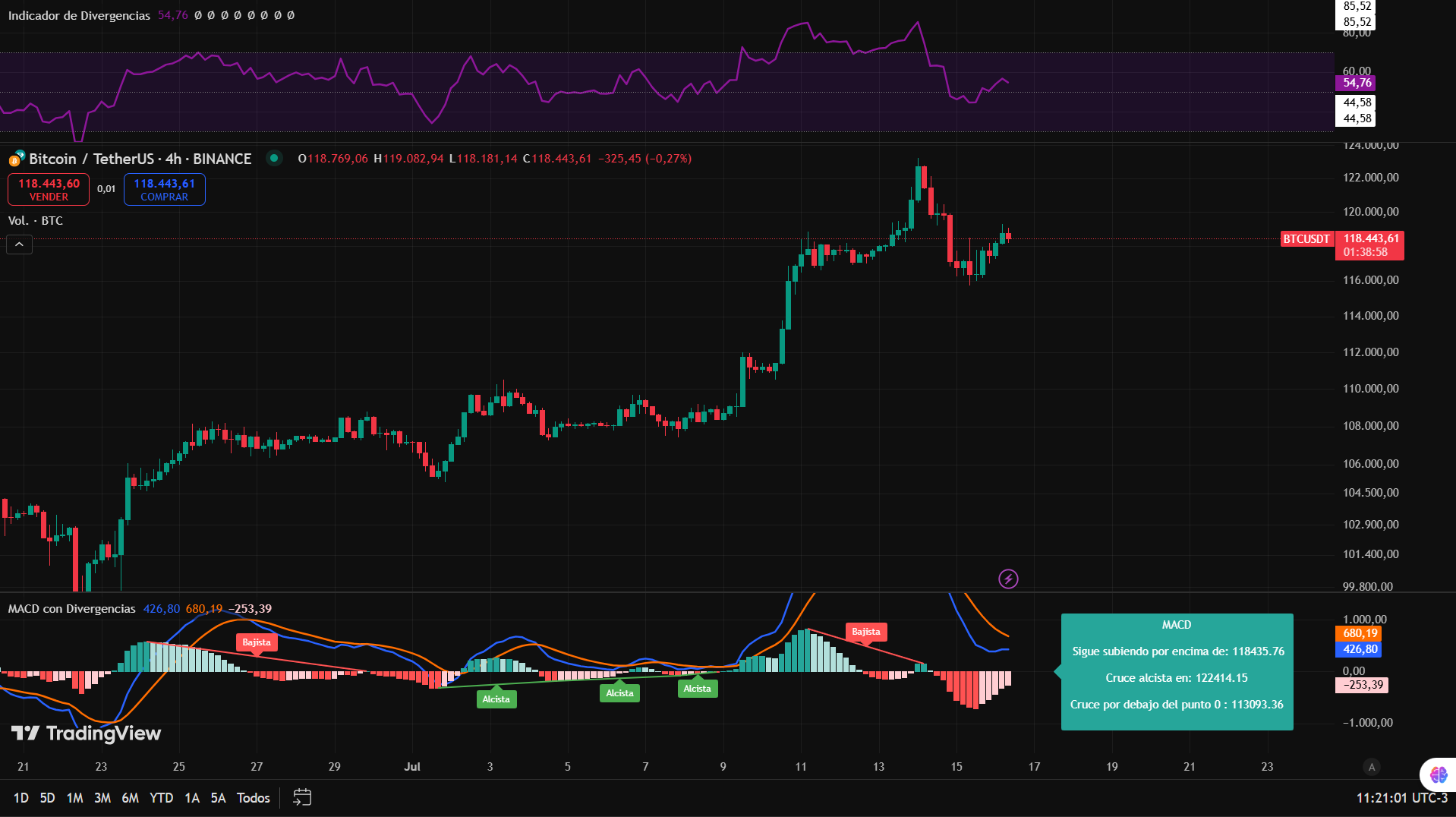 🗣️ Resumen de lo esperado hoy: Bitcoin inicia la semana mostrando un rebote técnico tras la corrección del fin de semana. El precio se mantiene en la zona de los 118.400 $, con velas de 4 h que marcan recuperación y moderación de la presión bajista. Aunque aún no se recupera del todo el impulso alcista anterior, los indicadores empiezan a mostrar señales de estabilización.