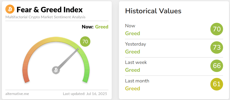 💜 Sentimiento de mercado: Estamos con 70 puntos, en avaricia.