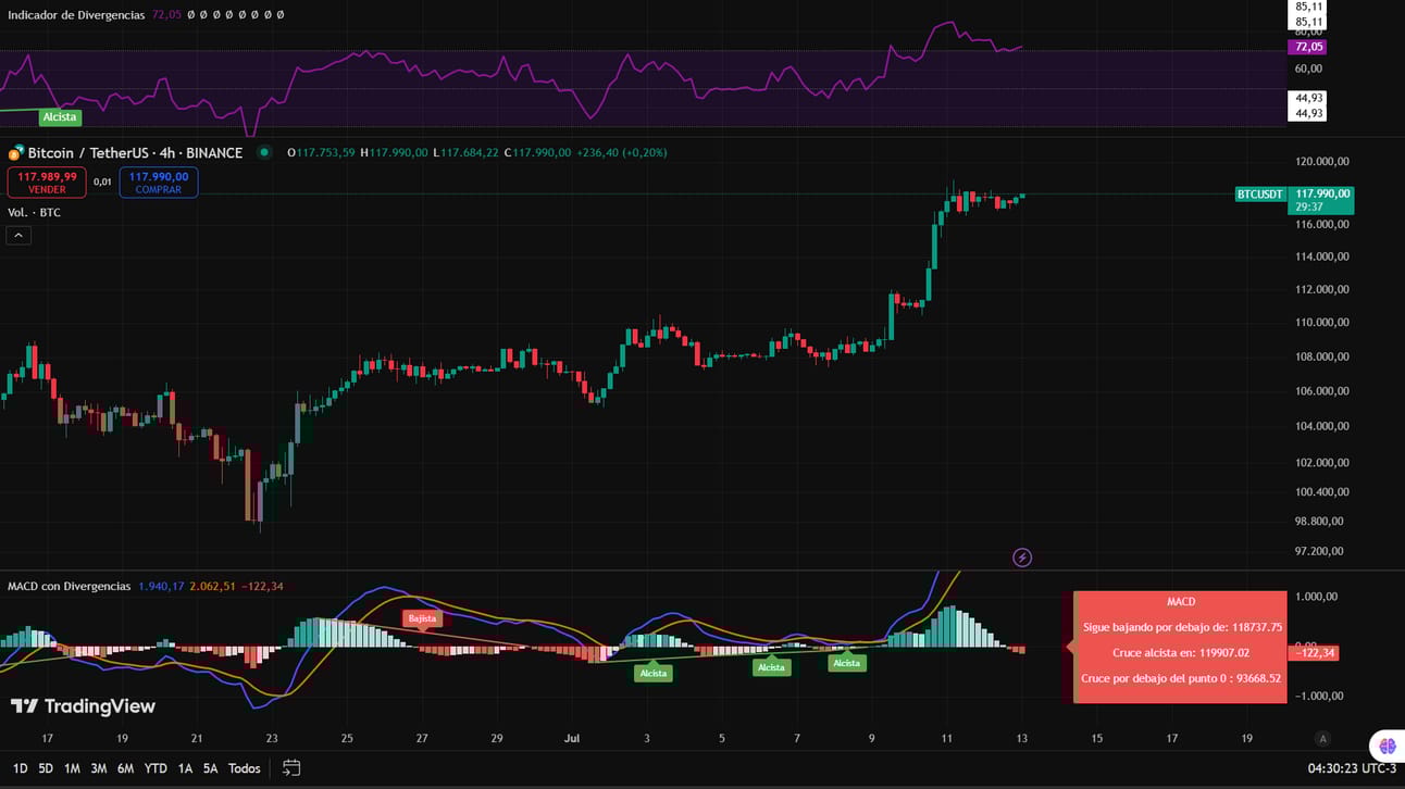 Gráfico 4 h: RSI en 72 puntos, ha comenzado a ceder luego de tocar la zona de sobrecompra. Esto refuerza la probabilidad de consolidación o corrección leve en las próximas velas.
