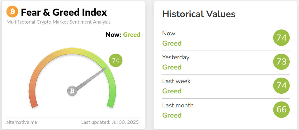 💜 Sentimiento de mercado: Estamos con 74 puntos, en avaricia.