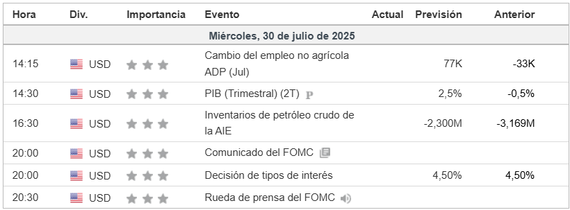 Este dia esta marcado por importantes publicaciones económicas. El empleo no agrícola ADP sorprendió positivamente con 77 K puestos creados, recuperándose del dato anterior negativo. Además, el PIB del segundo trimestre mostró un sólido crecimiento del 2,5 %, revirtiendo la contracción del -0,5 % del trimestre previo, lo que refuerza señales de reactivación económica.