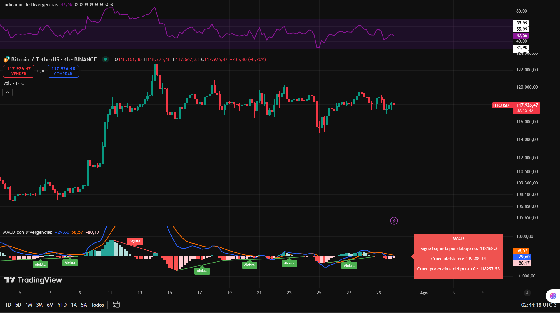 Resistencia clave: $118.300 techo técnico alineado con el punto cero del MACD$, en 119.300 cruce alcista proyectado, clave para romper hacia $120.000.