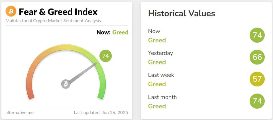 💜 Sentimiento de mercado: Seguimos en avaricia con 74 puntos.