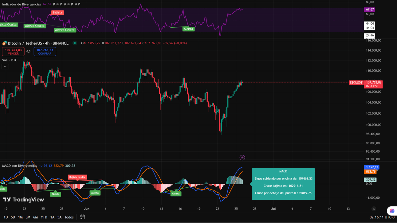 🗣️ Resumen de lo esperado hoy: Bitcoin sigue mostrando fortaleza, impulsándose hasta superar los 107 800 $, una continuación de su rally alcista. Tras una fase de consolidación entre 106 500–107 000 $, el precio ha ganado momentum.
