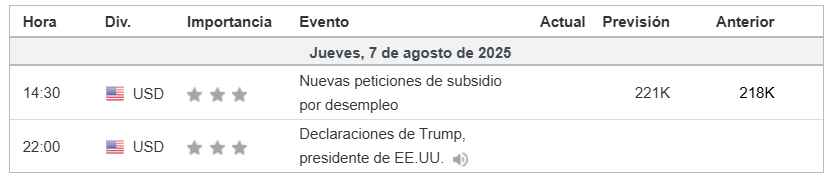 Las nuevas solicitudes de subsidio por desempleo en EE.UU. ascendieron a 221.000, superando ligeramente tanto la previsión de 218.000 como el dato anterior, lo que sugiere un pequeño deterioro en el mercado laboral. Además, se esperan declaraciones del presidente Trump a las 22:00, evento que podría generar volatilidad en los mercados dependiendo del tono y contenido de sus mensajes, especialmente si aborda temas económicos, fiscales o geopolíticos.