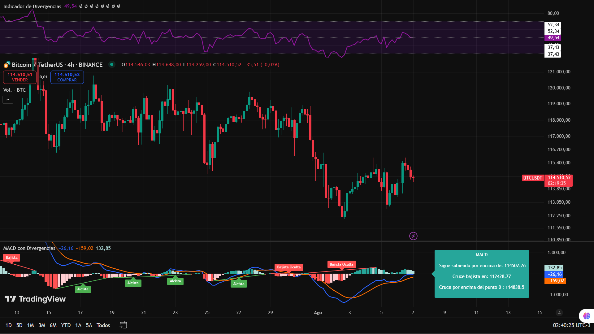 🗣️ Resumen de lo esperado hoy: El precio de Bitcoin muestra una leve recuperación tras el mínimo reciente en la zona de los $113.000. Si bien la estructura general se mantiene en un rango lateral bajista, el impulso alcista de las últimas velas sugiere que podríamos ver una continuidad hacia los $115.000–$115.400 si se sostiene la zona de los $114.500 como soporte inmediato.