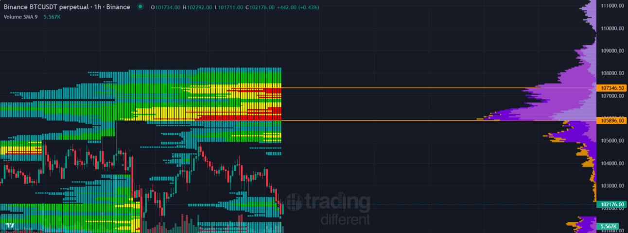 📈Mapa de Liquidaciones: En cuanto al mapa de liquidaciones, se ha generado una gran zona de liquidaciones entre los 105.800 $ y los 107.300 $, el primer valor esta por encima de nuestra resistencia, si logramos superarla es seguro que iriamos a todar todas esas liquidaciones, llegando asi a maximos historicos.