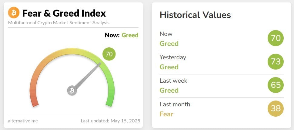 💜 Sentimiento de mercado: La avaricia bajo 3 puntos nuevamente y se encuentra en 70 puntos.