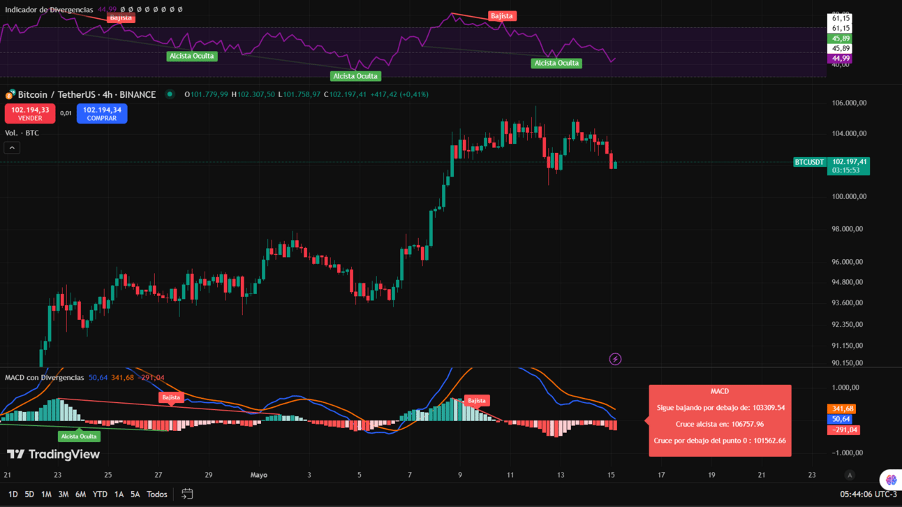 🗣️Resumen de lo esperado hoy: Bitcoin tuvo otra bajada pertinente, el precio bajo nuevamente hasta los 101,700 $, generenando asi un doble suelo en esta zona de soporte, aunque para terminar de corfirmarlo lo mas optimo seria esperar que termine de cerrar la vela en la que nos encontramos, pero todo indica que cerrara por encima de este valor, confirmandonos el doble suelo y posible rebote, quizas esta vez si lleguemos a maximos historicos.