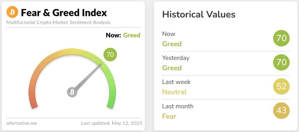 💜 Sentimiento de mercado: La avaricia se mantiene en 70 puntos.