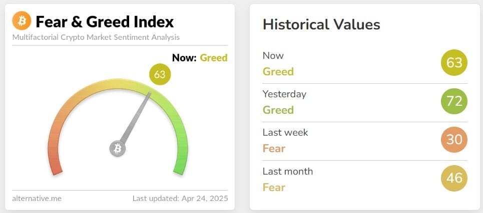 💜 Sentimiento de mercado: El mercado bajo un poco respecto ayer y se encuentra en los 63, sin embargo sigue estando en avaricia.