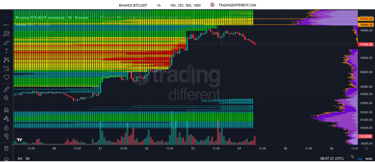 📈Mapa de Liquidaciones: En el mapa de liquidaciones podemos ver que no tenemos muchas liquidaciones importantes debajo, por lo que el precio no debe caer tanto, por otro lado en la zona de los 94.800 $ hasta los 95.725 $ se esta formando un cumulo de liquidaciones, puede crecer hoy antes de que el precio vaya a tomarlas.