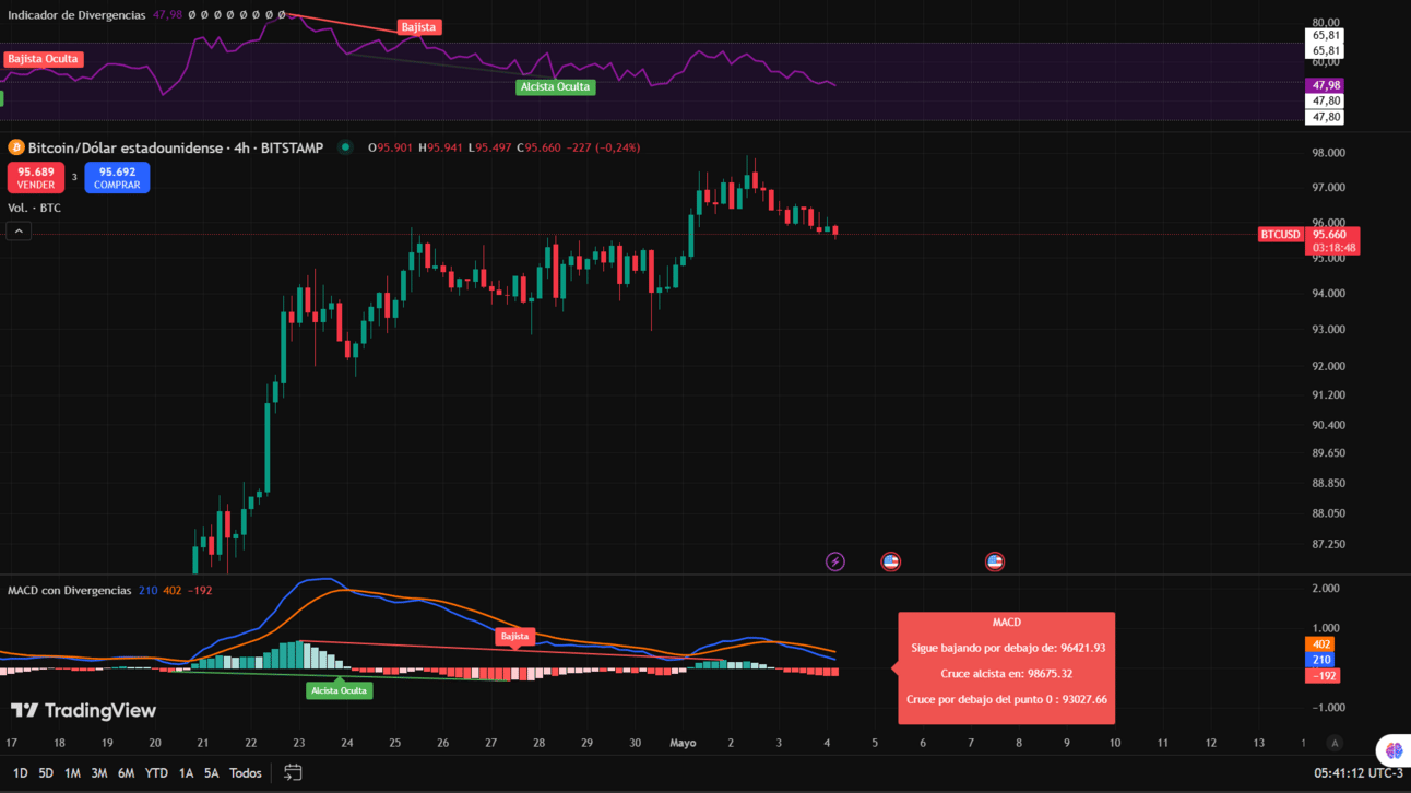 En cuanto a resistencias de corto plazo, tenemos una en los 96.400 $. El precio no logró superarla ayer, lo cual podría darnos un poco más de confianza respecto a la bajada que buscamos.