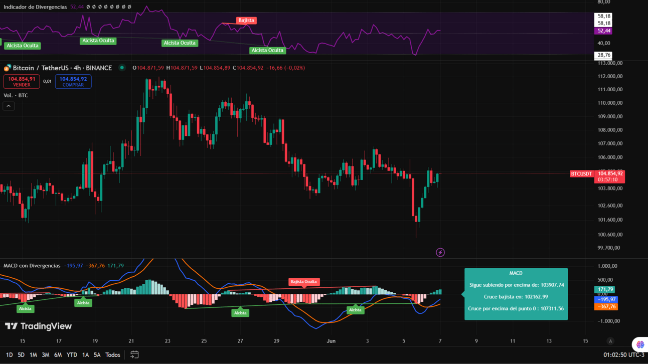 Ayer bitcoin recupero toda la caida que tuvimos, a pesar de esto la subida no logro superar los 105.000 $ lo cual se posiciona como nuestra resistencia mas cercana, una zona a superar si queremos volver a subir, por ahora el precio ha estado consolidandose, como ya es fin de semana es probable que veamos un mercado lateral y con poco movimiento, aun asi debemos estar atentos a cualquier cambio.