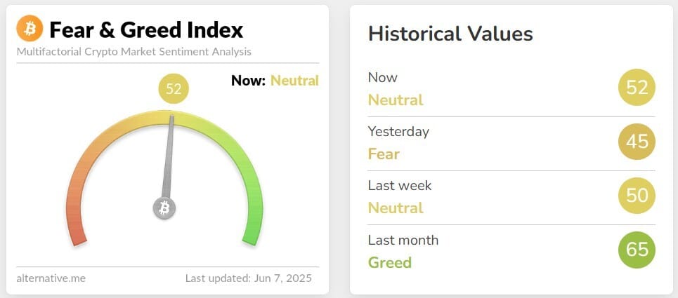 💜 Sentimiento de mercado: El mercado esta neutral con 52 puntos.
