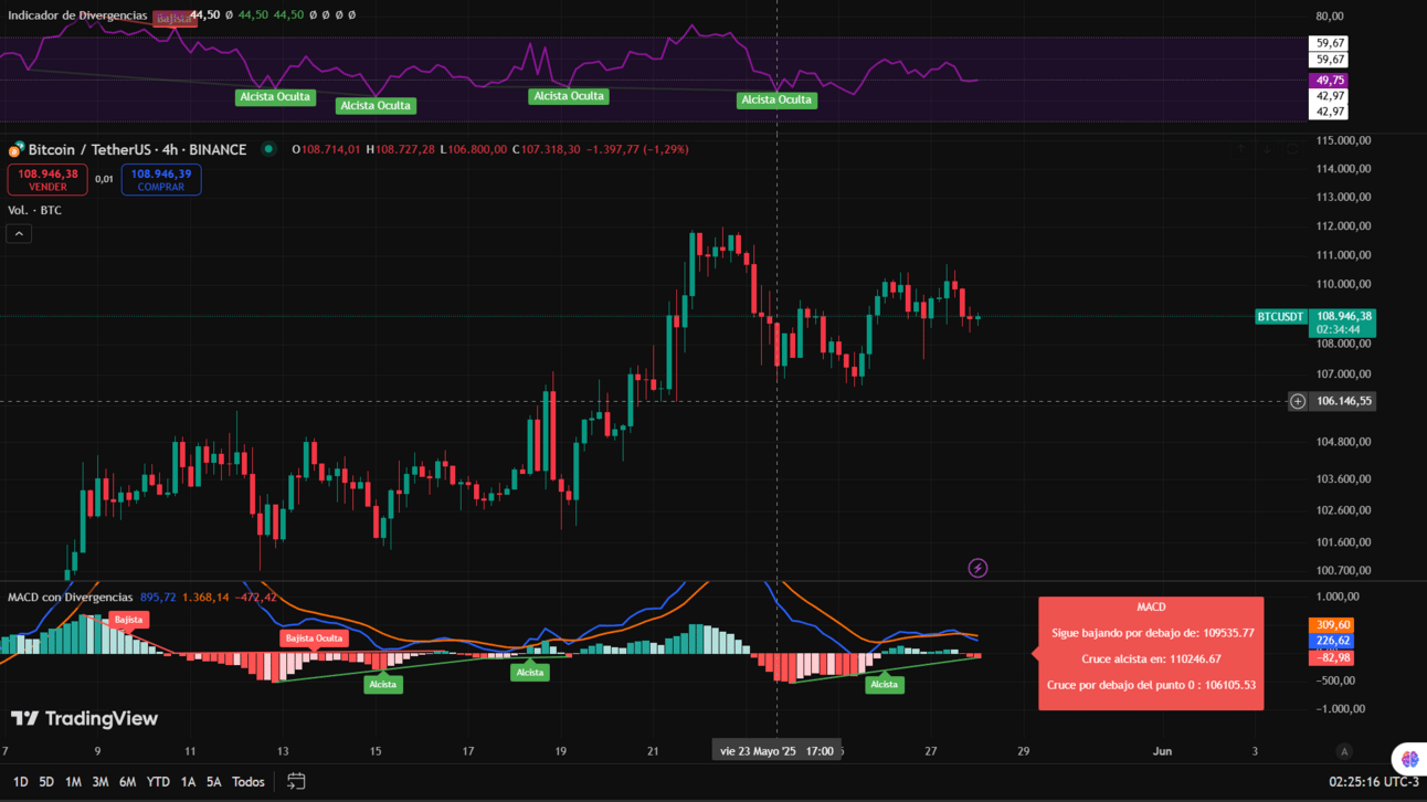 Bitcoin lleva toda la semana moviéndose dentro de un nuevo canal lateral, esta vez entre los 112.000 $ (máximo histórico) y los 106.500 $. El precio ha estado oscilando dentro de ese rango, pero con movimientos cada vez más suaves y sin demasiada fuerza, lo que podría indicar una fase de acumulación o preparación para el próximo gran movimiento. Dado el contexto actual, ese movimiento podría ser a la baja.