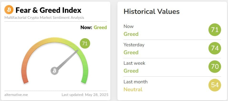 💜 Sentimiento de mercado: La avaricia se encuentra en 71 puntos.