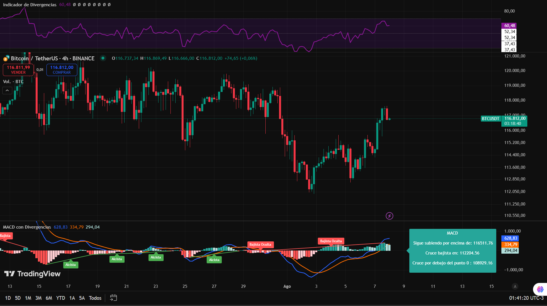 🗣️ Resumen de lo esperado hoy: Bitcoin sigue mostrando fuerza alcista tras la recuperación desde los $112 .000. Hoy se espera consolidación sobre los $116.500 con posibles intentos de ruptura hacia los $117.500. Sin embargo, el volumen aún no acompaña con claridad, por lo que podría haber retrocesos antes de continuar la tendencia. El mercado observa de cerca el comportamiento del RSI y posibles cruces en el MACD para confirmar dirección.
