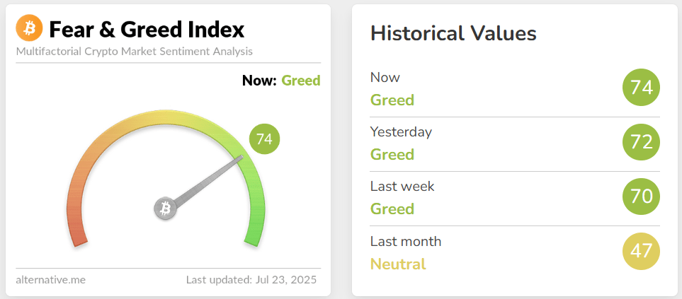 💜 Sentimiento de mercado: Estamos con 74 puntos, en avaricia.