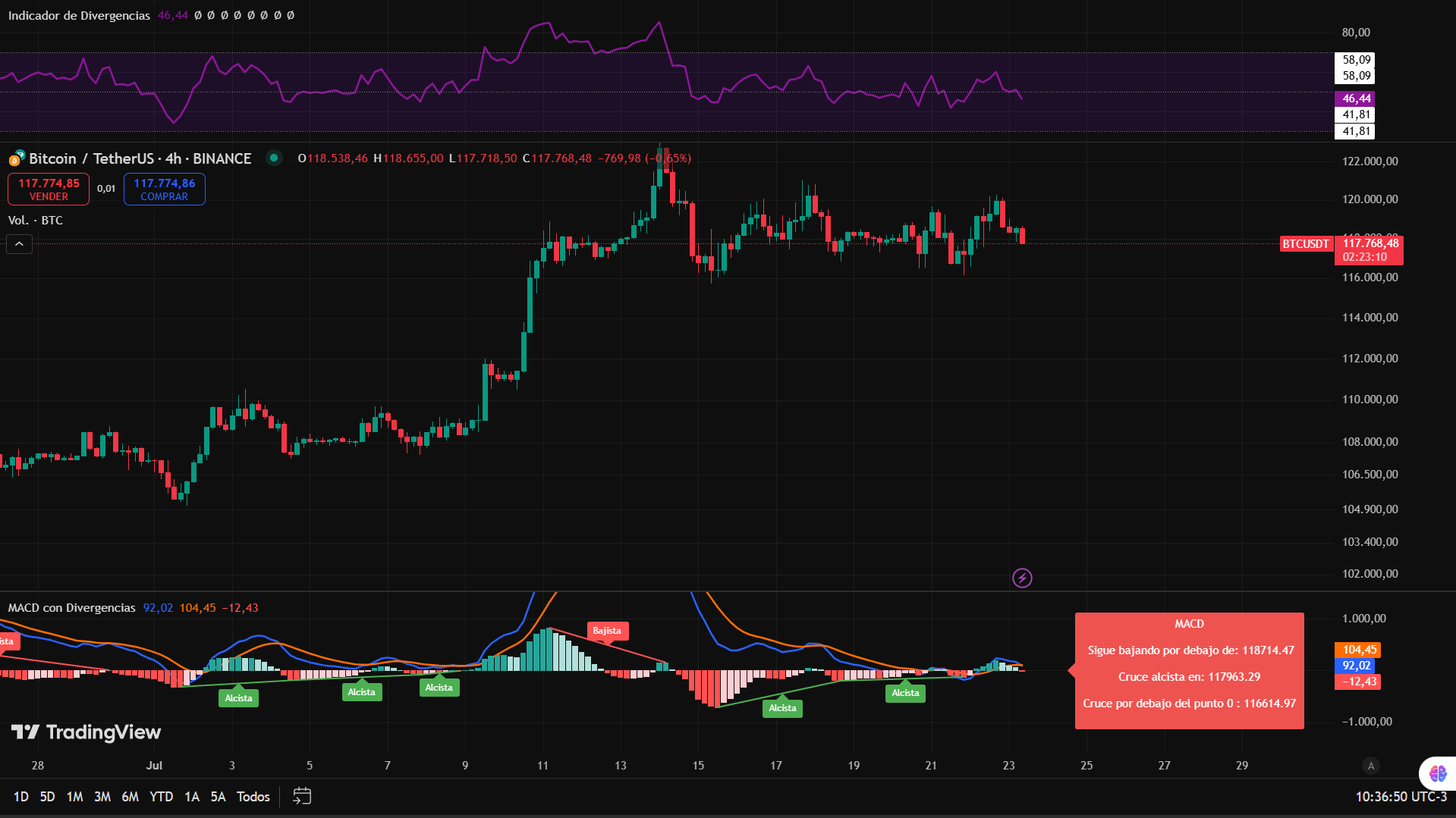🗣️ Resumen de lo esperado hoy: Bitcoin continúa en una fase de consolidación técnica. El MACD mantiene un sesgo levemente bajista con histograma en negativo, mientras el RSI en 4 h muestra señales de enfriamiento sin entrar aún en sobreventa. Para hoy se espera un movimiento lateral entre los 116.600 y 118.500, con mayor probabilidad de rebote si el soporte inferior se mantiene firme. En caso de ruptura, el siguiente nivel clave está cerca de los 115.500.