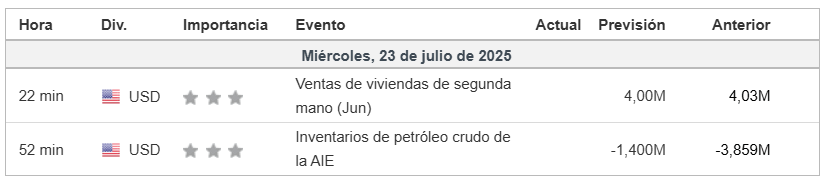 Los datos reflejan un leve enfriamiento en el mercado inmobiliario de EE.UU. Las ventas de viviendas de segunda mano cayeron ligeramente a 4,00 millones, por debajo de la previsión y del dato anterior (4,03M), lo que sugiere cierta cautela por parte de los compradores. Por otro lado, los inventarios de petróleo crudo de la AIE disminuyeron menos de lo esperado (-1,400M frente a -3,859M previos), lo que podría indicar una menor demanda o un repunte en la producción.