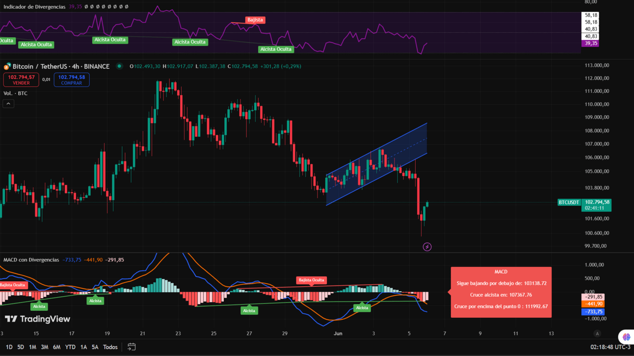 El precio cayó hasta los niveles previstos luego de confirmarse la ruptura del canal. Si bien no alcanzamos el objetivo de los 100.000 $, el impulso alcista fue significativo, llegando hasta los 101.300 $. A partir de ahí, el precio ha estado en una fase de reversión, aunque esto podría ser solo una trampa antes de una caída adicional. Será clave observar los movimientos de hoy para anticipar qué podría ocurrir durante el fin de semana.