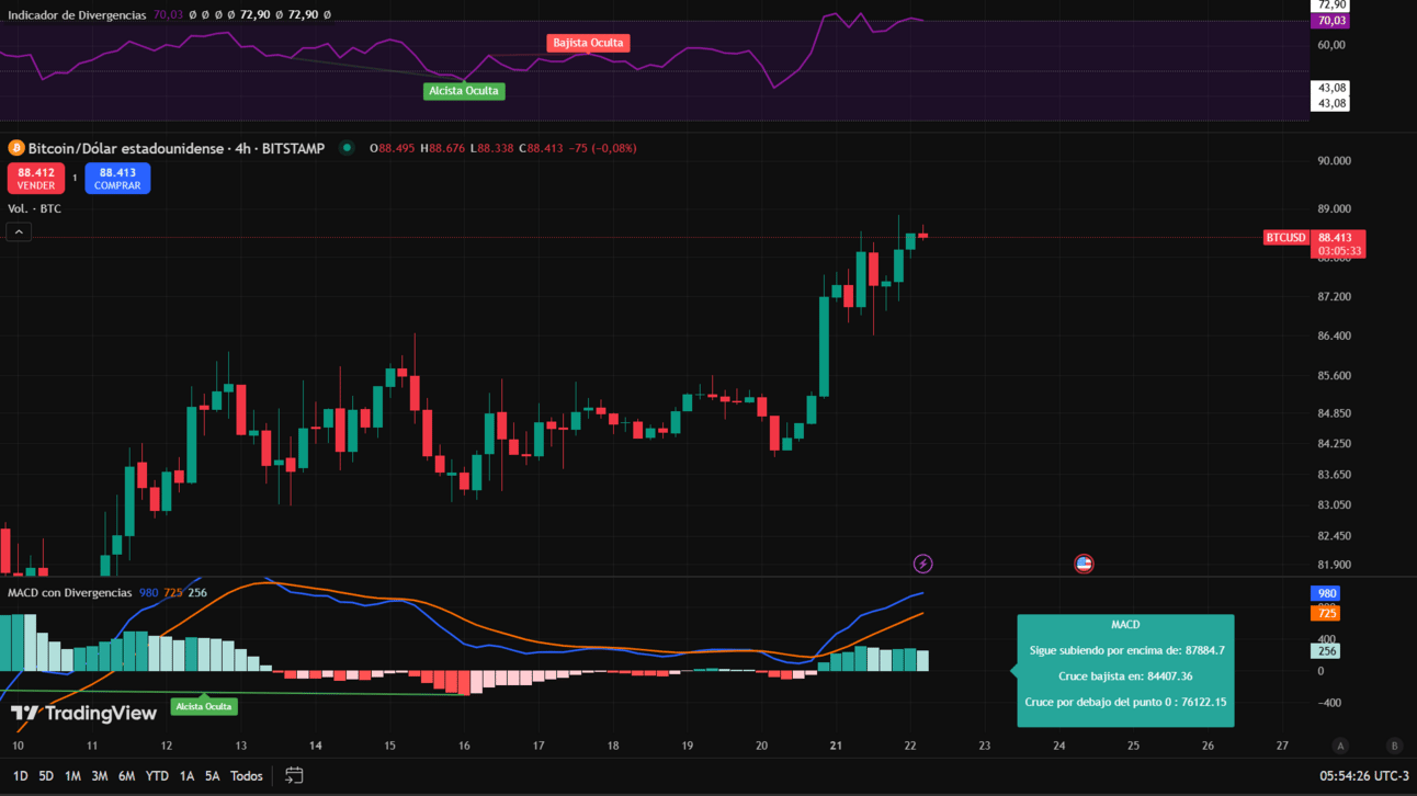 🗣️Resumen de lo esperado hoy: Bitcoin sigue subiendo, aunque encuentra freno en los 88.500 $, Bitcoin continúa su tendencia alcista, pero ha encontrado un freno en la zona de los 88.500 $, que por ahora se muestra difícil de superar a corto plazo debido a la sobrecompra. Aun así, las correcciones han sido leves: el precio no ha logrado bajar de los 87.000 $, lo que genera un escenario más optimista para el periodo alcista que esperamos. El MACD muestra signos de pérdida de fuerza, por lo que podríamos ver una nueva corrección en las próximas horas antes del siguiente impulso.