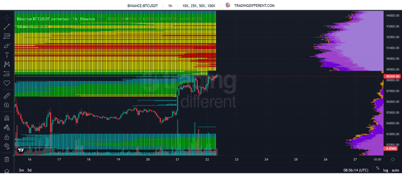 📈Mapa de Liquidaciones: En el mapa de liquidaciones podemos observar un gran cúmulo de órdenes concentradas hasta la zona de los 92.200 $. Por debajo, prácticamente no hay acumulaciones significativas, lo que sugiere que, en caso de correcciones, estas podrían ser leves antes del próximo impulso. Si logramos superar con fuerza los 88.500 $, podríamos ver una subida directa hacia los 92.200 $ sin demasiados obstáculos en el camino.